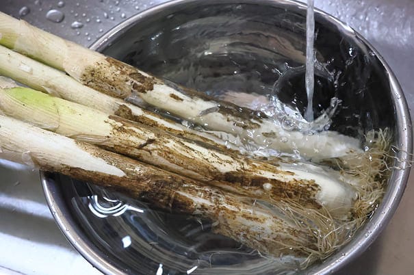 Řez proveďte asi 5 cm nad bílou částí. Zelené listy podélně rozkrojíme. Právě tady se usazuje nejvíce nečistot, a proto je potřeba zelenou část důkladně omýt. Rozevřete naříznuté listy pod tekoucí studenou vodou a pečlivě je propláchněte. Voda se tak dostane do všech záhybů, kde se skrývá hlína a písek.