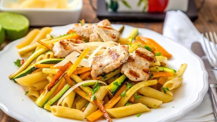 Recept: Lehký těstovinový salát s penne, zeleninou a krůtím masem