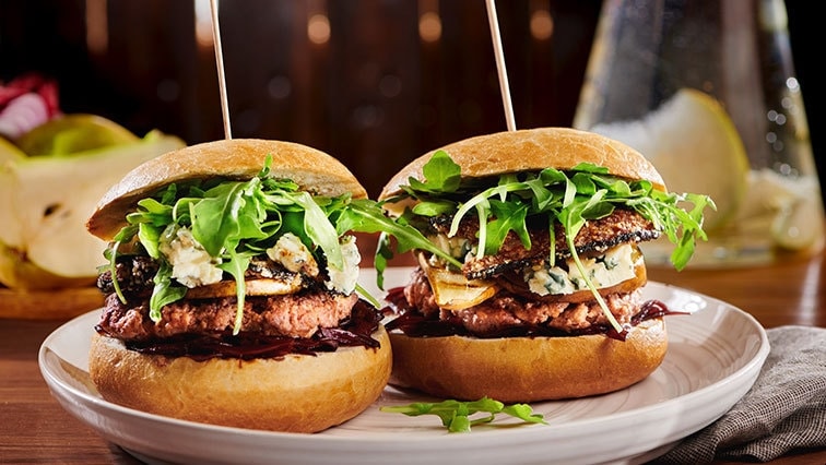 Vyzkoušejte náš recept na domácí burgery s modrým sýrem a hruškou.