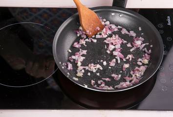 Zatímco se těsto peče, v pánvi začněte opékat cibuli. Po pěti minutách přidejte česnek a chvíli restujte.