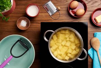 Brambory oloupeme, nakrájíme a uvaříme, vodu slijeme.