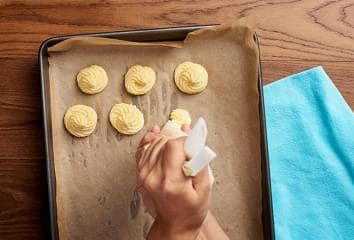 Sáček na zdobení naplníme bramborovým pyré a na pečicí plech nastříkáme pusinky. Plech vložíme do lednice a necháme zchladit.