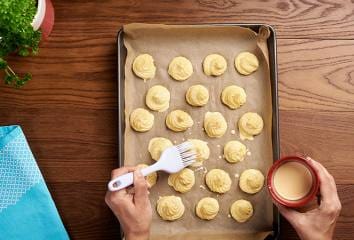 Troubu rozehřejeme na 190 °C. Rozšleháme celá vejce se zbytkem smetany. Vyjmeme plech z lednice a bramborové pusinky opatrně potřeme směsí vajec a smetany. Pečeme dozlatova.
