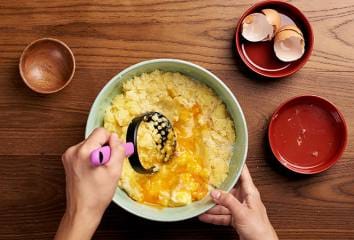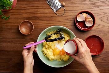 Brambory rozmačkáme, přidáme žloutky, máslo a polovinu soli, pepř, muškátový oříšek a ¾ smetany.