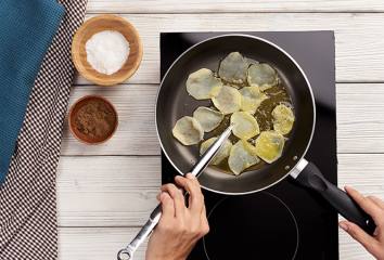 Plátky brambor opečeme dokřupava. Polévku servírujeme s plátky slaniny a opečených brambor.