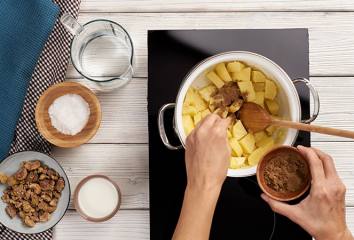 Omyjeme a nakrájíme pět brambor a jednu cibuli. Oloupeme jednu velkou bramboru a nakrájíme ji na tenké plátky, které si dáme stranou. Osmažíme cibuli na oleji, přidáme brambory, kmín, sůl, pepř a promícháme. Přilijeme vodu a pomalu vaříme 10–15 minut.