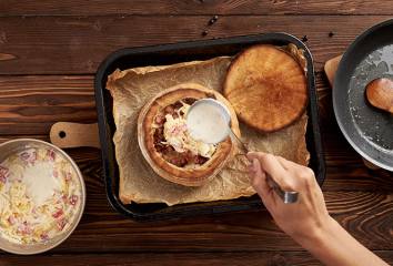 Odklopíme „víko“ z chleba. Přidáme nakrájené kousky chleba z vnitřku na plech a vrátíme zpátky do trouby. Fondue a chlebové „lžíce“ pečeme dalších 10–15 minut. Necháme trochu vychladnout a můžeme podávat.