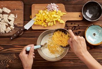 Ve velké míse smícháme sýry se smetanou.