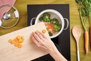 Nakrájíme brokolici a mrkev na malé kousky a kolečka. Jedno kolečko mrkve překrojíme napůl.