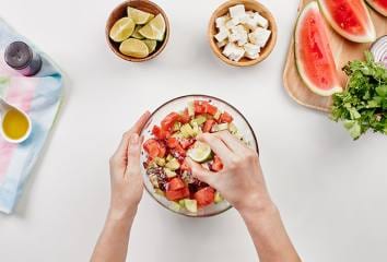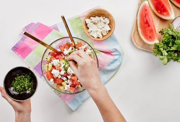 Vyzkoušejte meloun trochu jinak! V kombinaci s okurkou, limetkou a koriandrem meloun dokonale vynikne. A sýr Feta vše jen podtrhne.