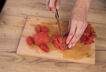 Až budou lilky zhruba po třech minutách měkké, přidejte oloupaná rajčata. Střídavě míchejte.