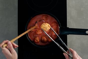 Rajčata nebo protlak zahřejeme v kastrolu nebo hlubší pánvi, přidáme bazalku a podle chuti sůl, případně trošku cukru. Osmažené lilkové kuličky vkládáme do rajčatové omáčky a povaříme asi 10 minut. Před podáváním můžeme posypat strouhaným parmazánem a ozdobit bazalkou.