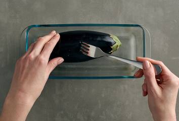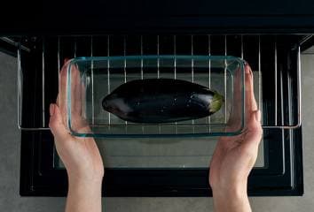 Troubu vyhřejeme na 200 °C. Lilek propícháme vidličkou.
