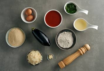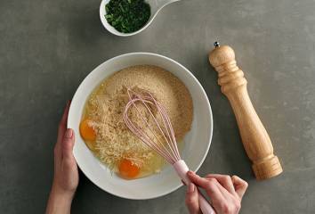 V míse vyšleháme vejce, přidáme prolisovaný česnek, parmezán, bylinky, sůl, strouhanku a baklažánovou dužinu.