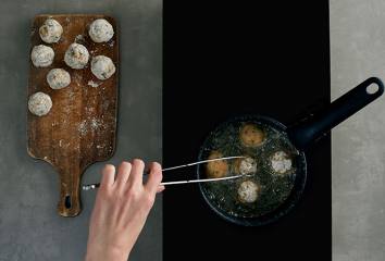 Rukama formujeme malé pevné kuličky a rovnoměrně je obalíme v mouce.