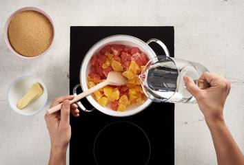 Přidáme cukr, kondenzovaný zázvor a citrusovou kůru. Vaříme při vysoké teplotě za častého míchání dalších 20–30 minut, dokud směs nezačne houstnout.