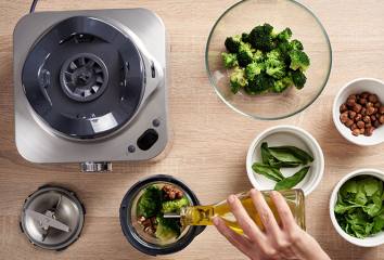 Smícháme brokolici, bazalku, petržel, ořechy a 1 lžíci oleje a rozmixujeme.
