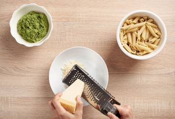Těstoviny smícháme s pestem a česnekem dohromady v míse a podáváme posypané ořechy a parmezánem.