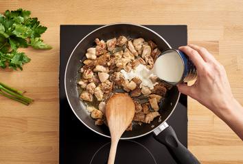 Do pánve dáme maso, nastrouhaný sýr, zalijeme vodou z těstovin a přidáme smetanu.