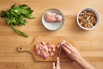 Kuřecí maso nakrájíme na kousky. Namočíme houby do vody.