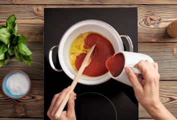 Připravíme si omáčku. Na oleji osmahneme drcený česnek a přilejeme rajčatový protlak. Osolíme, opepříme a necháme povařit.