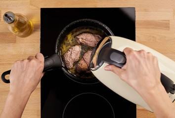 Nakrájíme cibuli na kostičky. Rozpálíme na pánvi olej a rolády restujeme ze všech stran, aby se maso zatáhlo. Poté přilijeme horkou vodu a vaříme vše zhruba ještě 40 minut. Pokud je třeba, zredukujeme množství šťávy. Tip na servírování: Podáváme s rýží a překrojené napůl, aby na pohled vynikly suroviny uvnitř rolády.