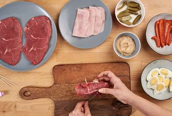 Srolujeme maso a omotáme ho nití, případně propíchneme párátkem.