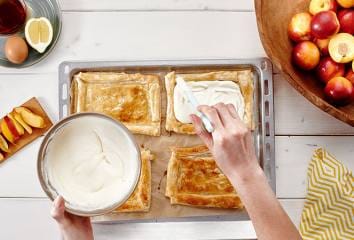 Na zcela vychladlé pečivo natřeme náplň, na ni naskládáme plátky nektarinek, pokapeme javorovým sirupem a podáváme.