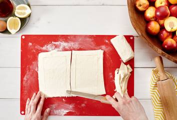 Těsto rozválíme, nakrájíme na 4 stejně velké čtverce a s dostatečnými rozestupy uložíme na plech.