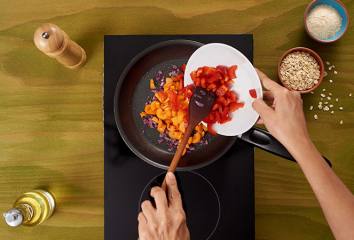 V pánvi rozehřejeme olej a vložíme zeleninu s výjimkou česneku. Podusíme, přidáme česnek a dusíme další minutu.