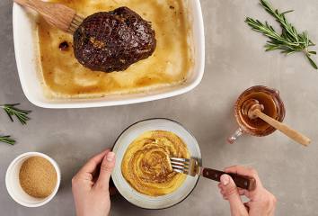 Na oběd si můžete vychutnávat pěkně uzenou šunku s medovohořčičným glazé a rozmarýnovými bramborami.